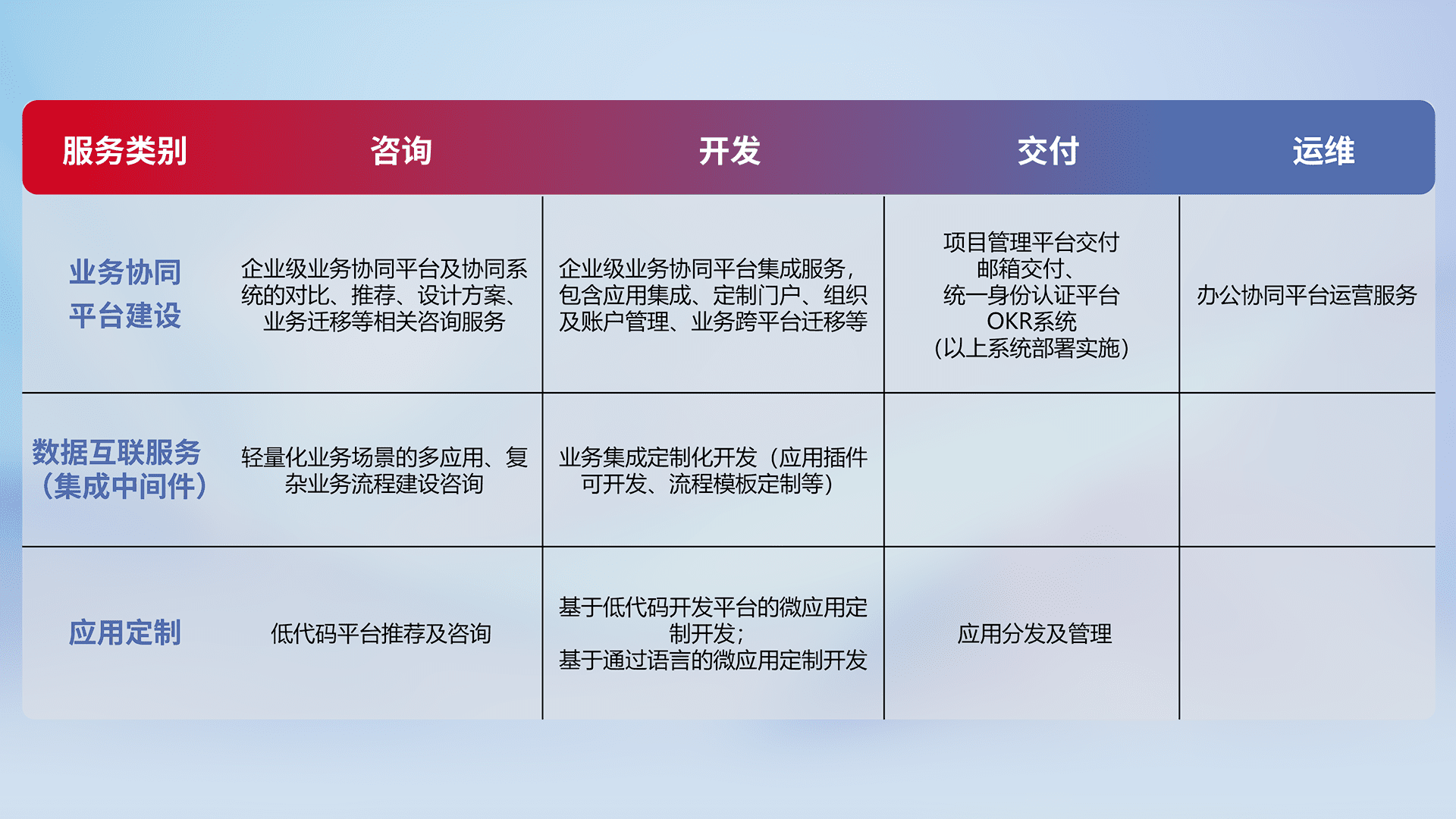 针对钉钉、、、企微、、、、IDaas等平台级产品提供产品的规划、、、方案、、、、交付、、、、定制化开发等服务,,,实现如统一协同办公、、、、智能客户服务、、、、混合会议管理、、、、智能数据查询、、、等业务场景,,实现数字化转型。。。。